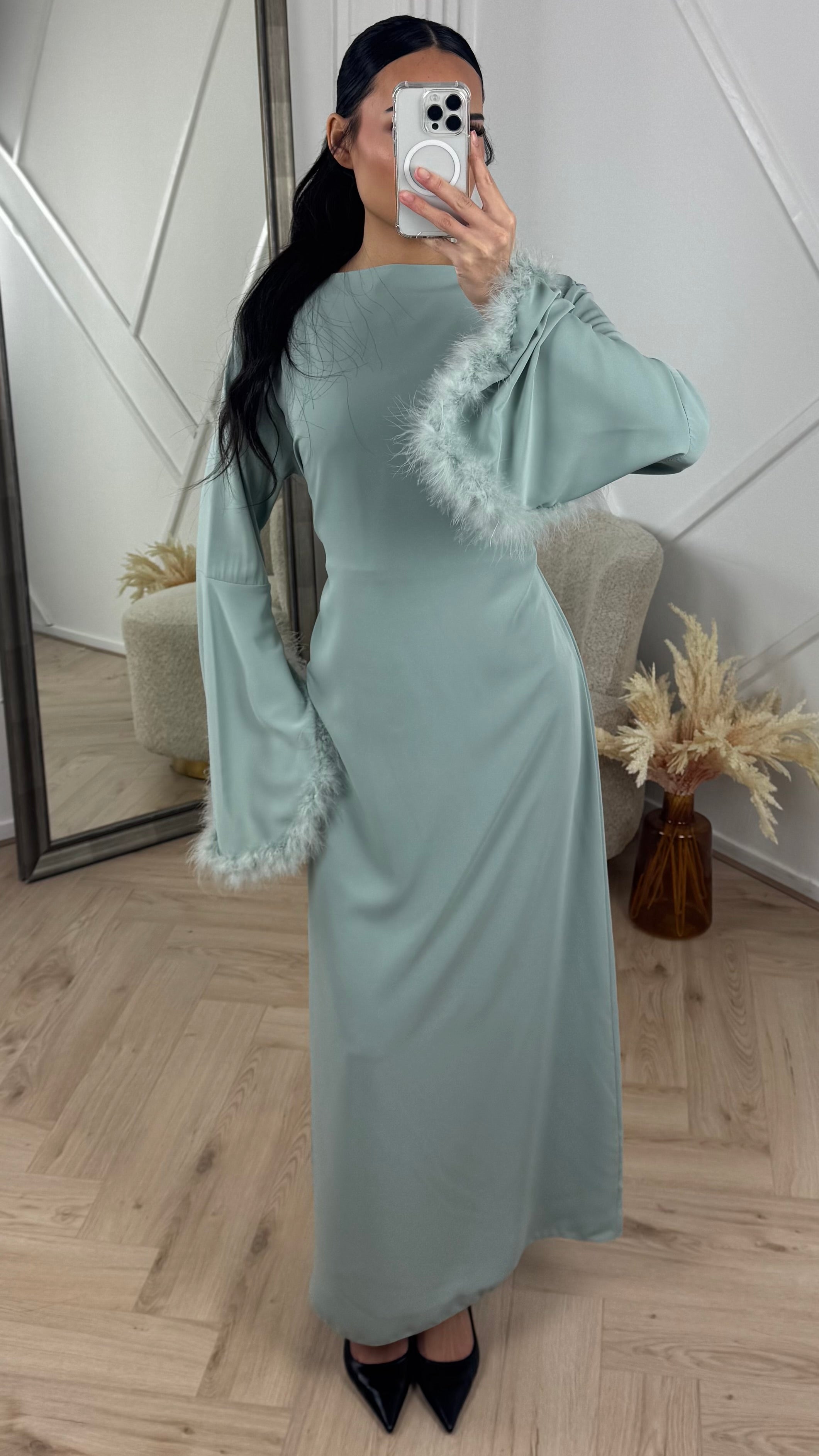 Abaya Maxi Jurk met Feather Manchetten en Taillekoord