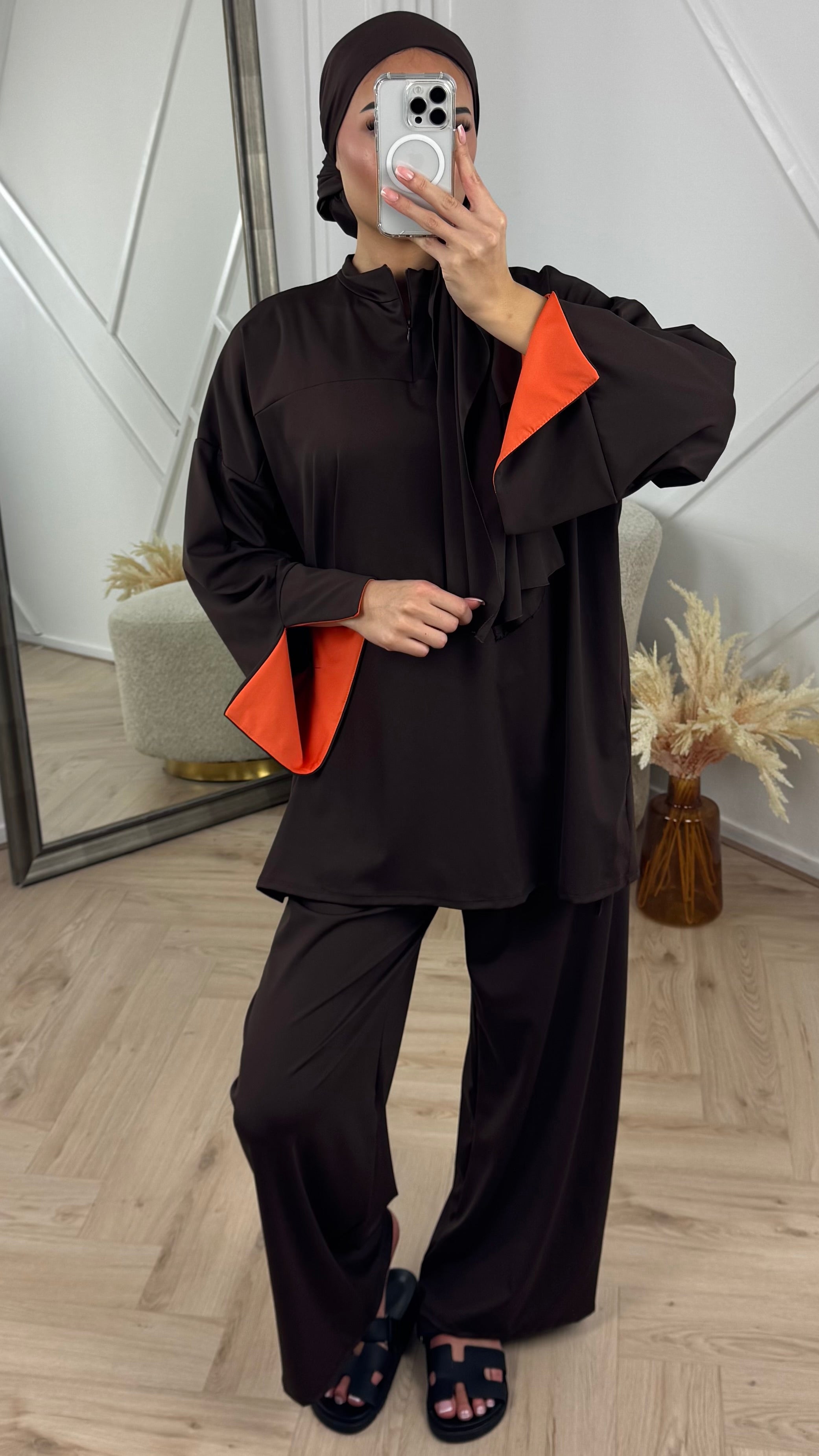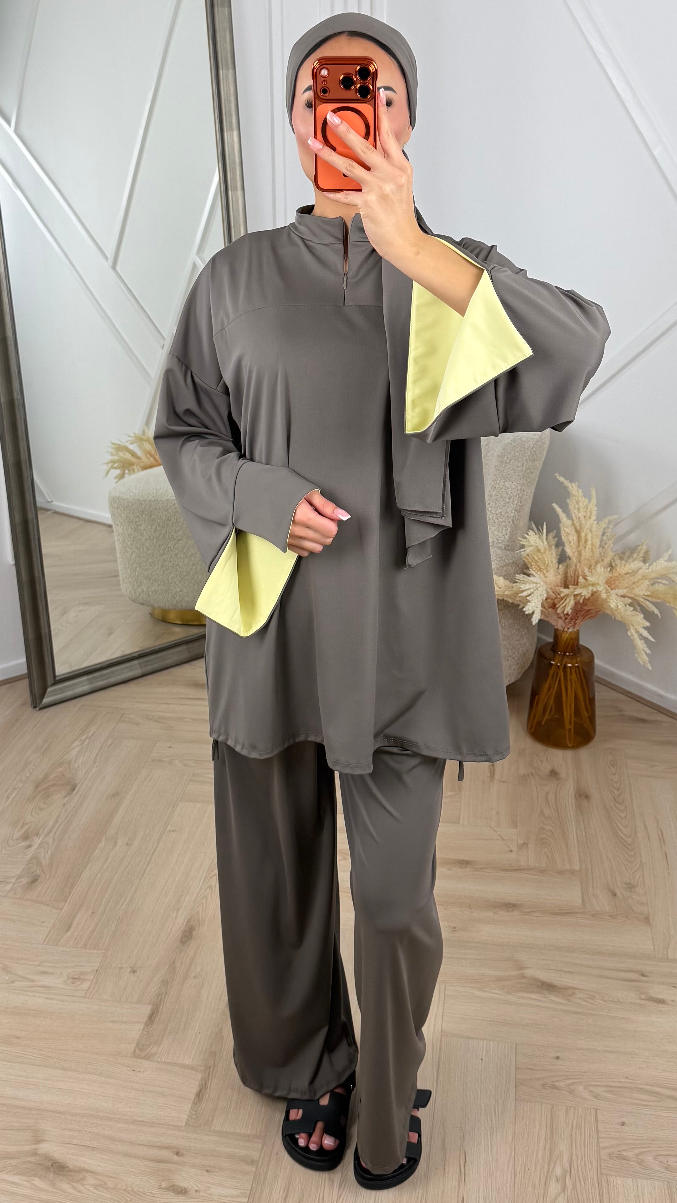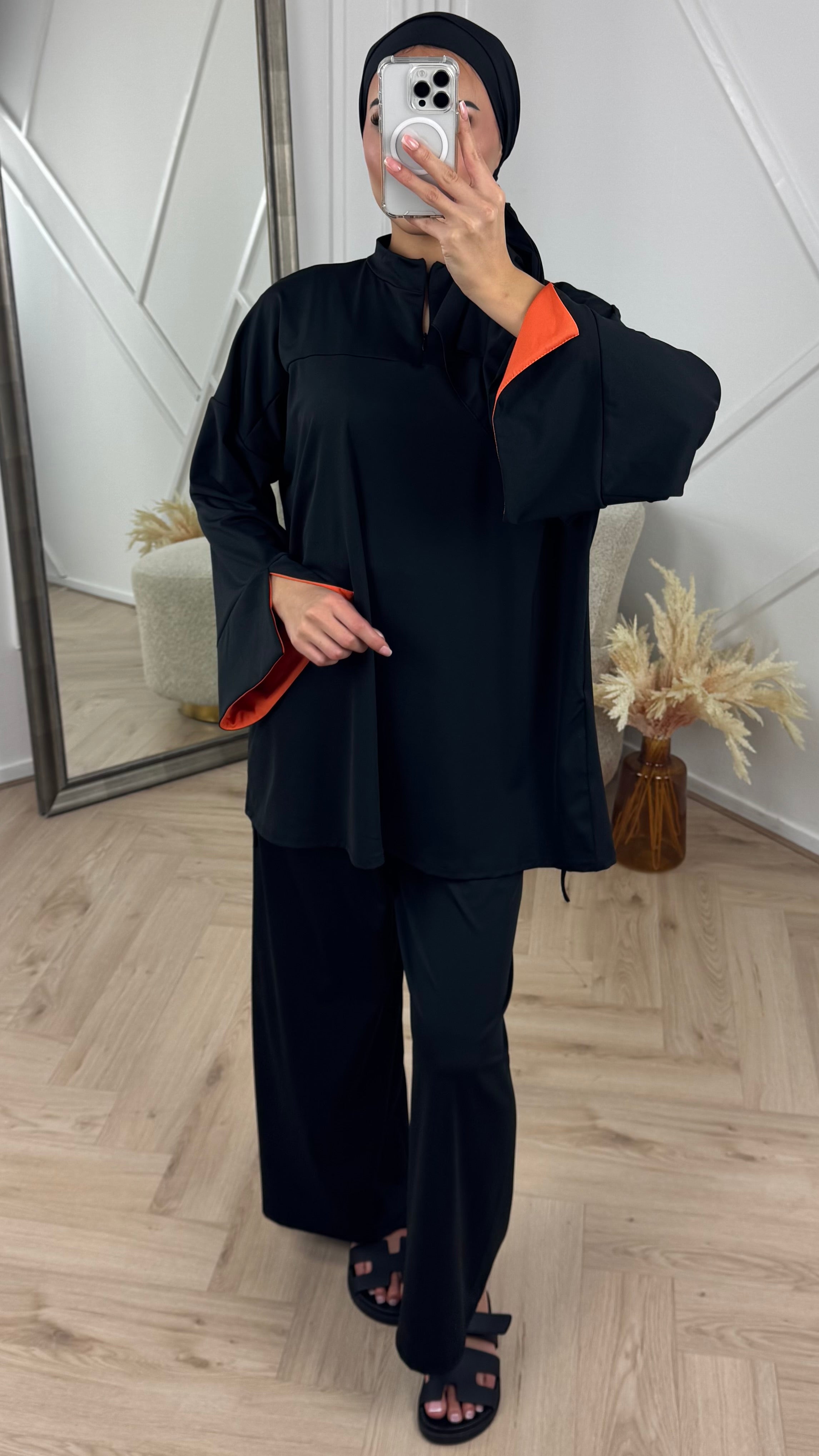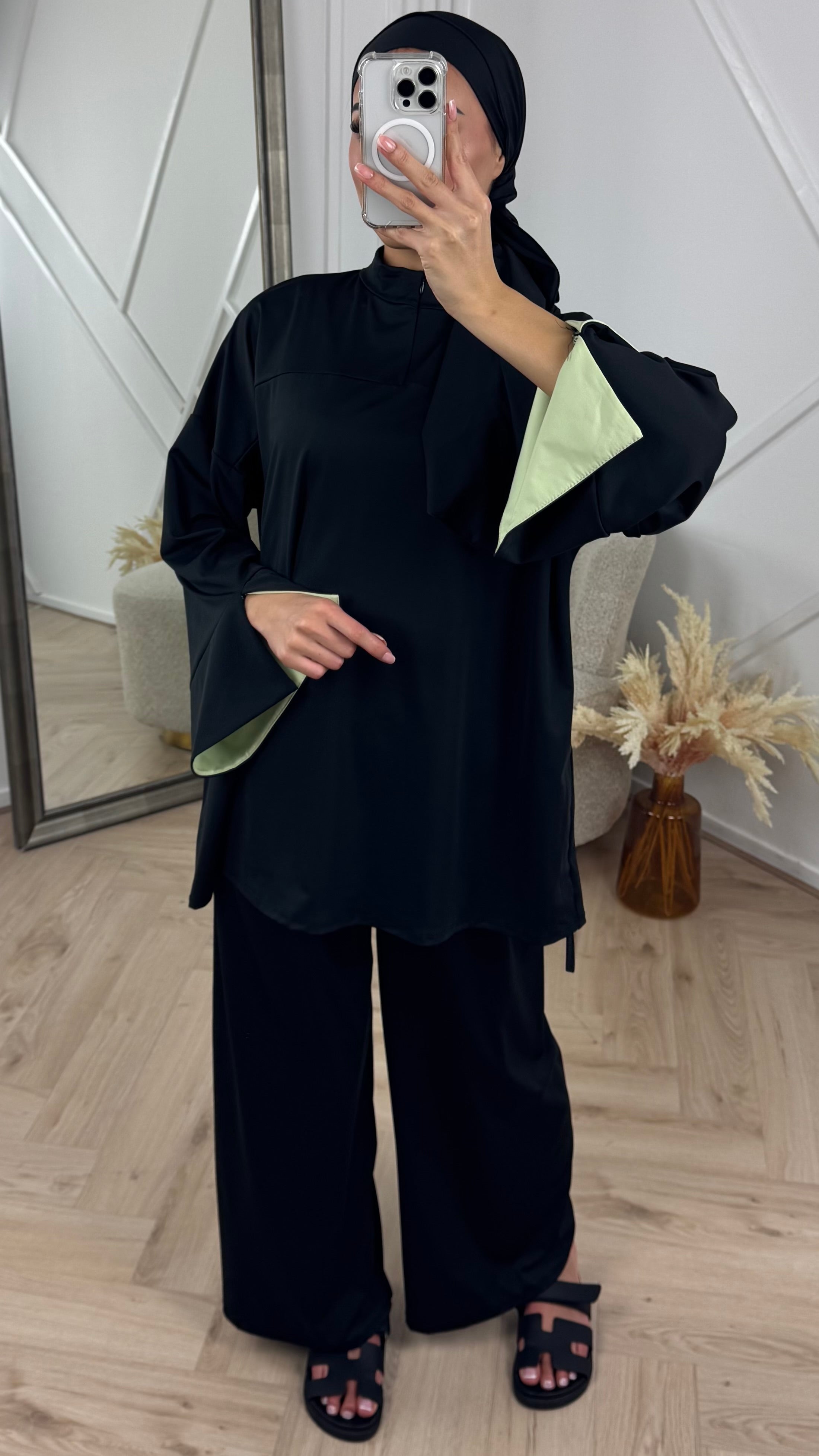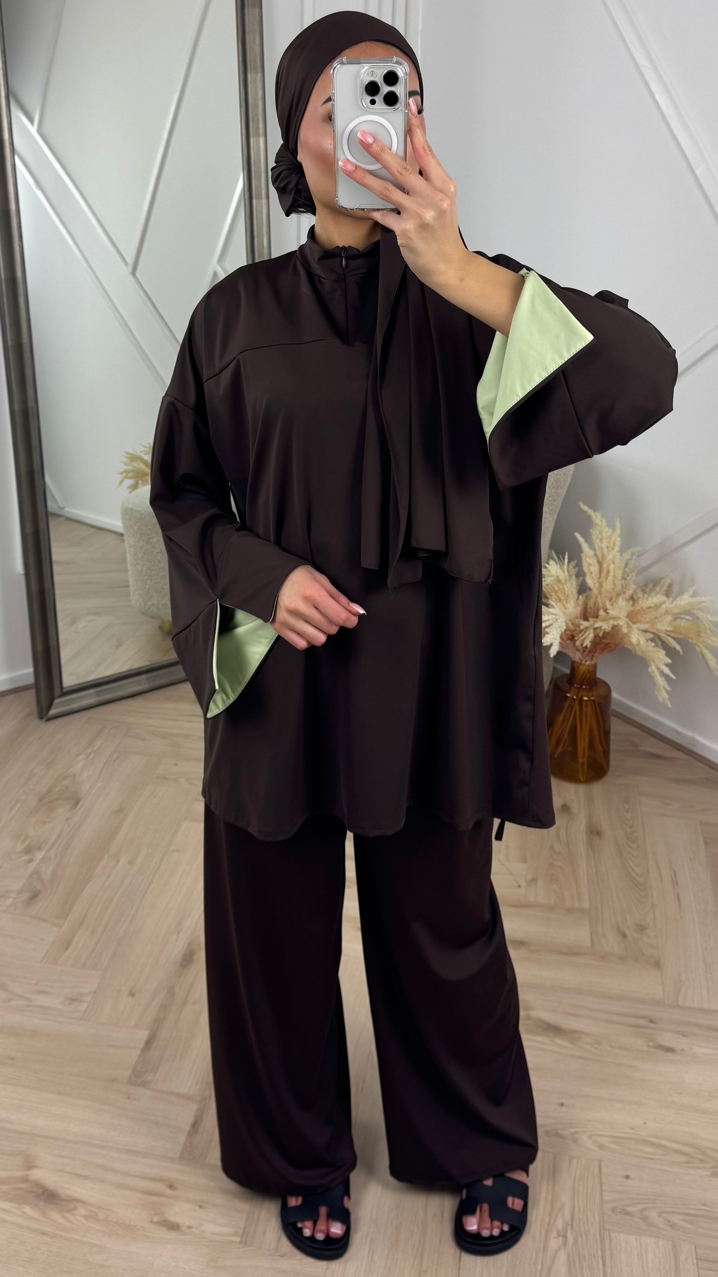 De set wordt geleverd met een bijpassende hijab, waardoor je outfit direct compleet is.
