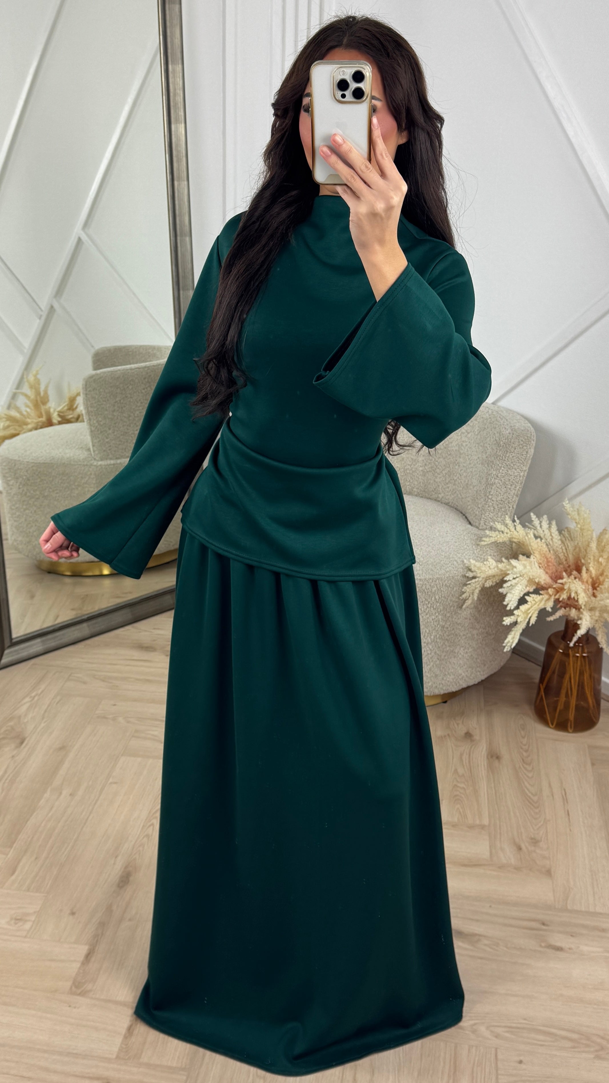 Deze luxe rok set combineert elegantie en comfort in één stijlvolle outfit. De hoge hals en het verfijnde taillelint aan de achterkant creëren een vrouwelijk, ingetogen silhouet. De soepelvallende stof zorgt voor een perfecte pasvorm, terwijl de plooien in de rok voor extra flair zorgen. Ideaal voor zowel formele gelegenheden als stijlvolle day-to-day looks.