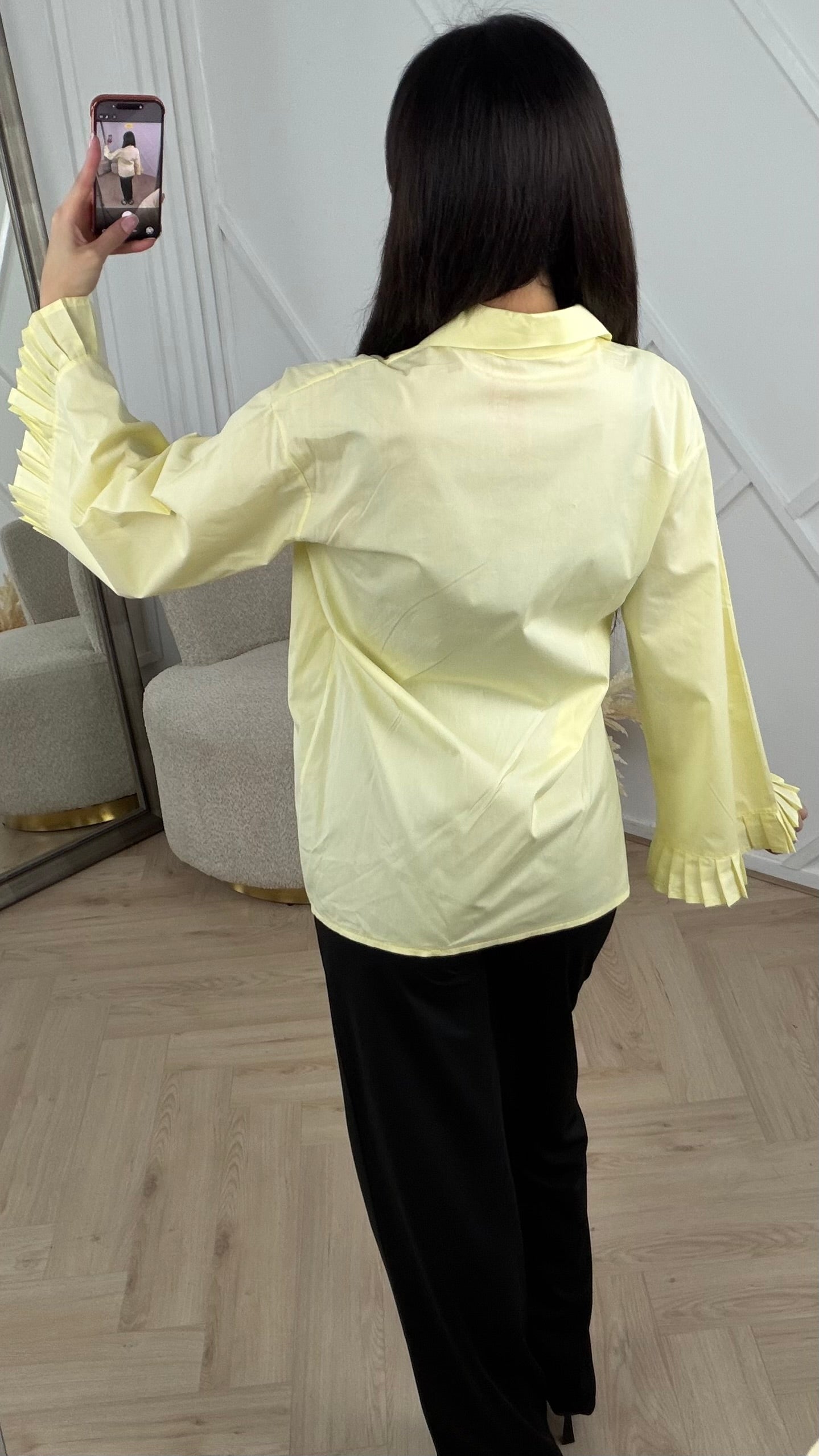 De mouwen vallen wijd en zijn afgewerkt met subtiele plooien aan de uiteinden, wat zorgt voor een elegante touch zonder overdreven te zijn. De stof voelt stevig en glad aan, wat de blouse een nette en verzorgde uitstraling geeft.