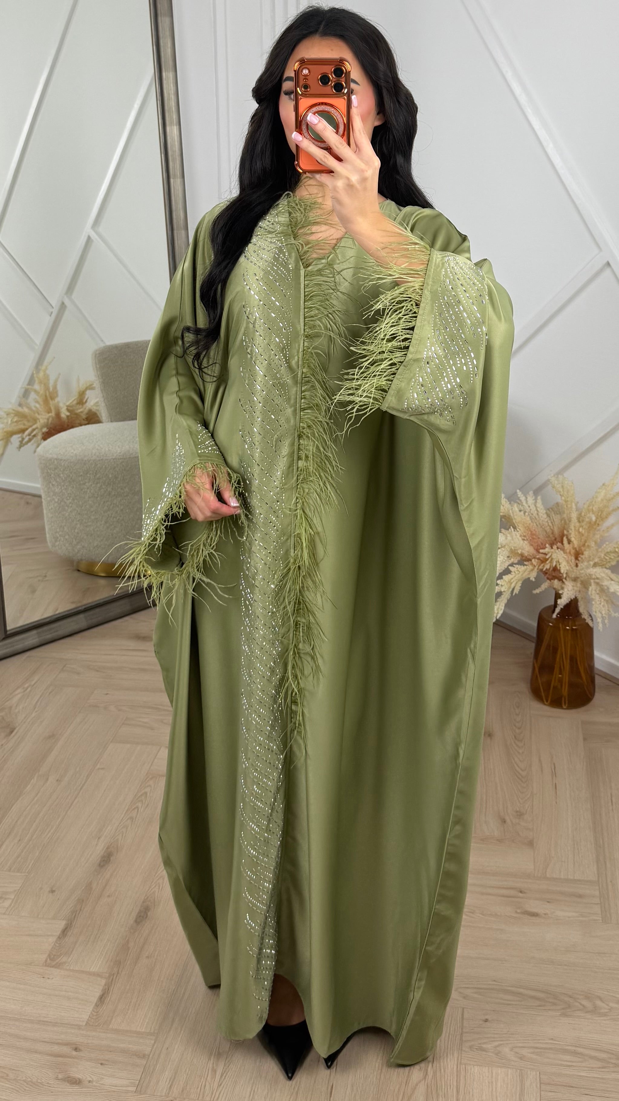 Satijnen Abaya Maxi Jurk met Veren en Strass Details – Mukistore.com Skip to content