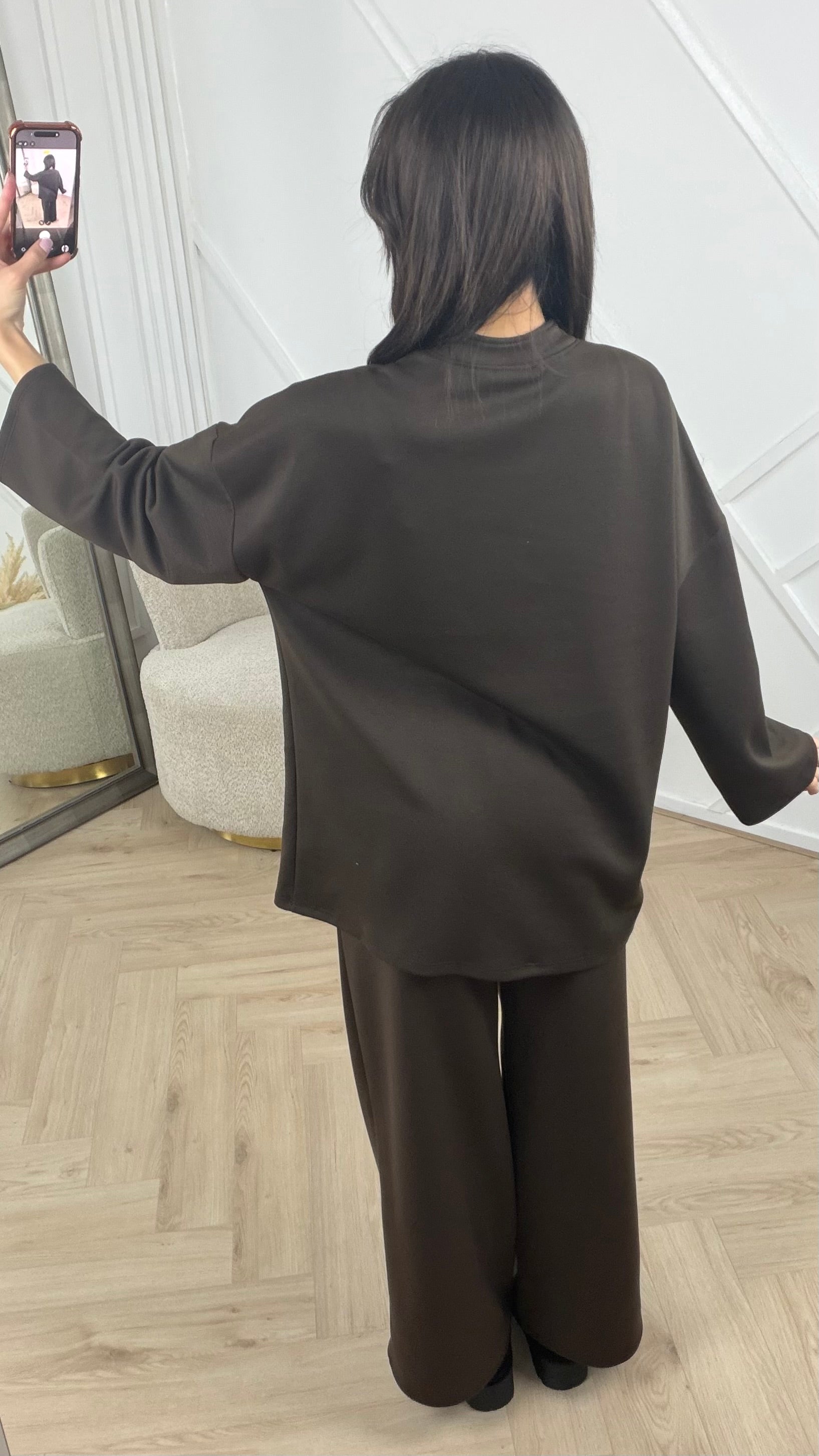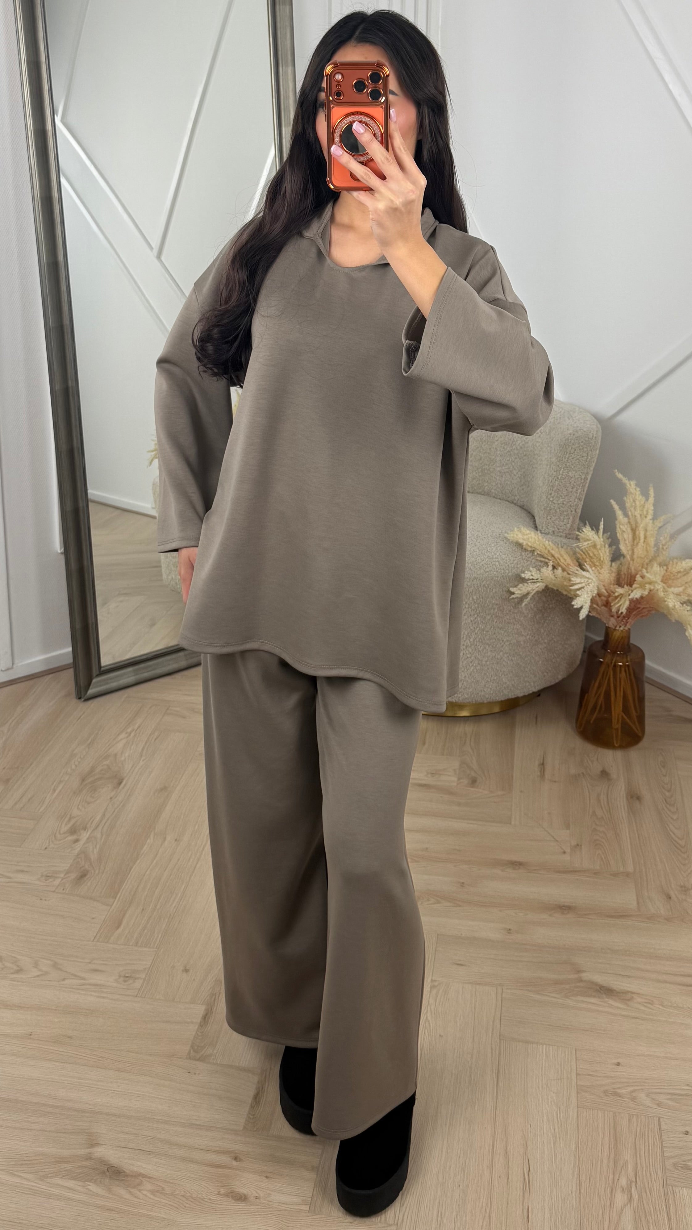 Deze two-piece set bestaat uit een losvallende tuniek met een subtiele V-inkeping en een bijpassende wijde broek. De stof voelt zacht en soepel aan en heeft een matte, rustige uitstraling. De tuniek valt los over het lichaam en eindigt ruim over de heupen, terwijl de broek met rechte pijpen voor een comfortabele en elegante fit zorgt. Samen vormt dit een stijlvolle, draagbare set die zowel geschikt is voor dagelijks gebruik als voor nette momenten.