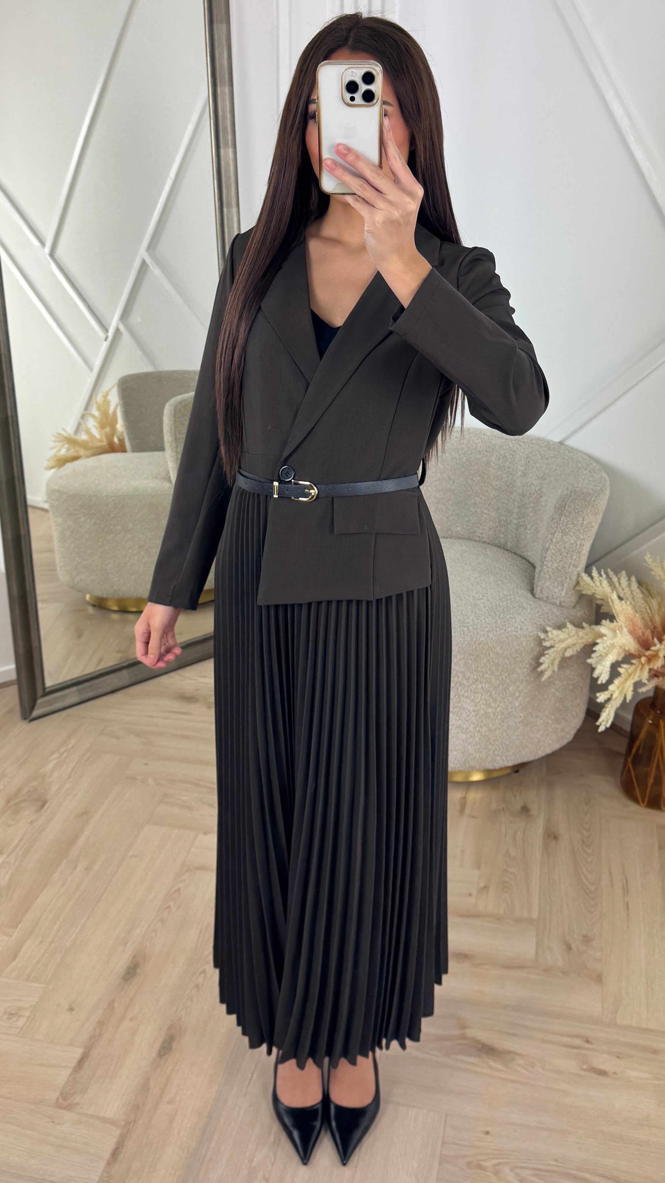 Luxe Blazer Plissé Maxi Jurk met Ceintuur – Mukistore.com Ga naar inhoud