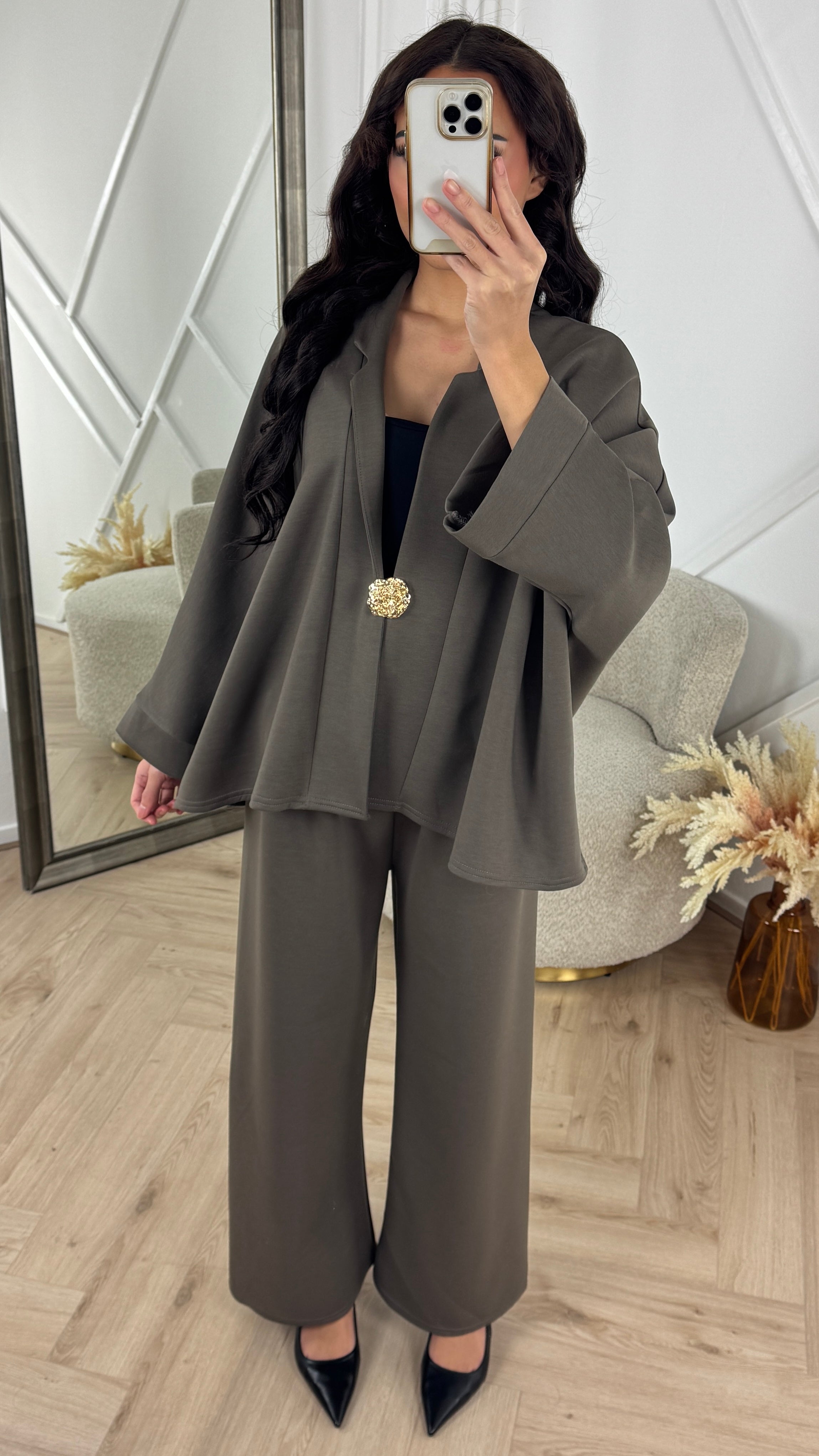 Deze luxe two-piece set straalt klasse en eenvoud uit. De soepelvallende stof met gladde binnenkant voelt heerlijk zacht aan, terwijl de afneembare gouden broche zorgt voor een verfijnde, chique touch. Perfect voor een elegante daglook of avondoutfit – combineer met hakken of loafers voor een moeiteloos stijlvolle uitstraling.