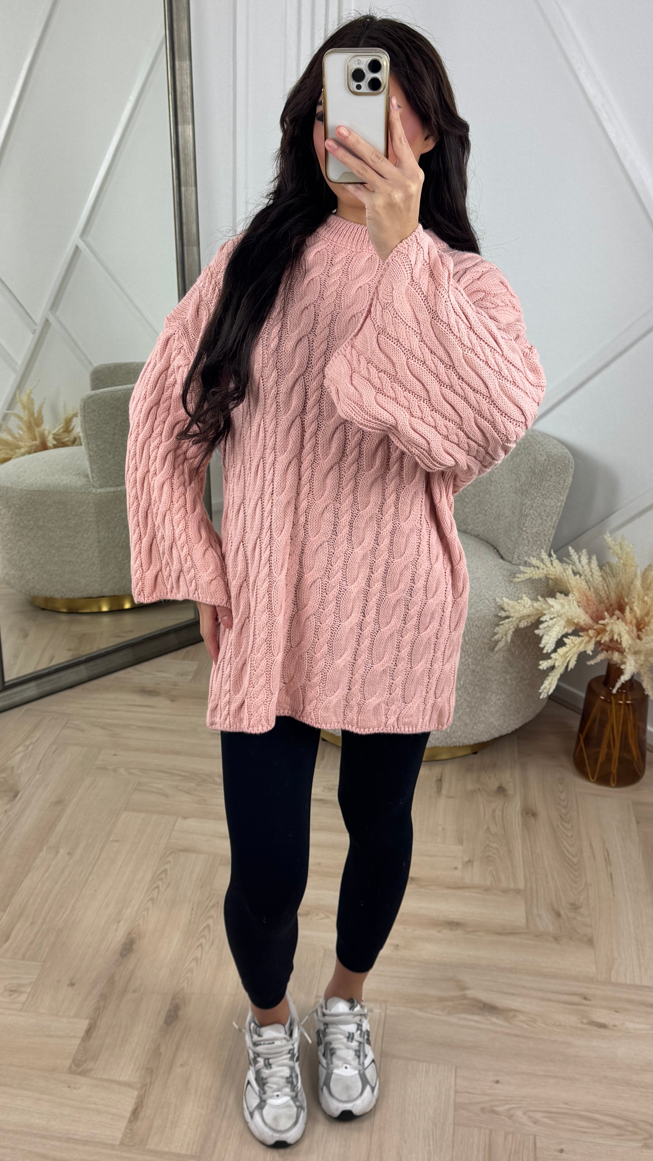 Deze oversized cable knit trui is een echte essential voor het najaar en de winter. De combinatie van de grovere kabelstructuur en de wijdvallende mouwen geeft de trui een luxe, cozy uitstraling. Dankzij de langere fit valt hij mooi over de heupen en kun je hem eindeloos combineren—van comfy leggings tot een casual jeans look. De stof voelt zacht aan op de huid en biedt precies genoeg comfort voor elke dag.