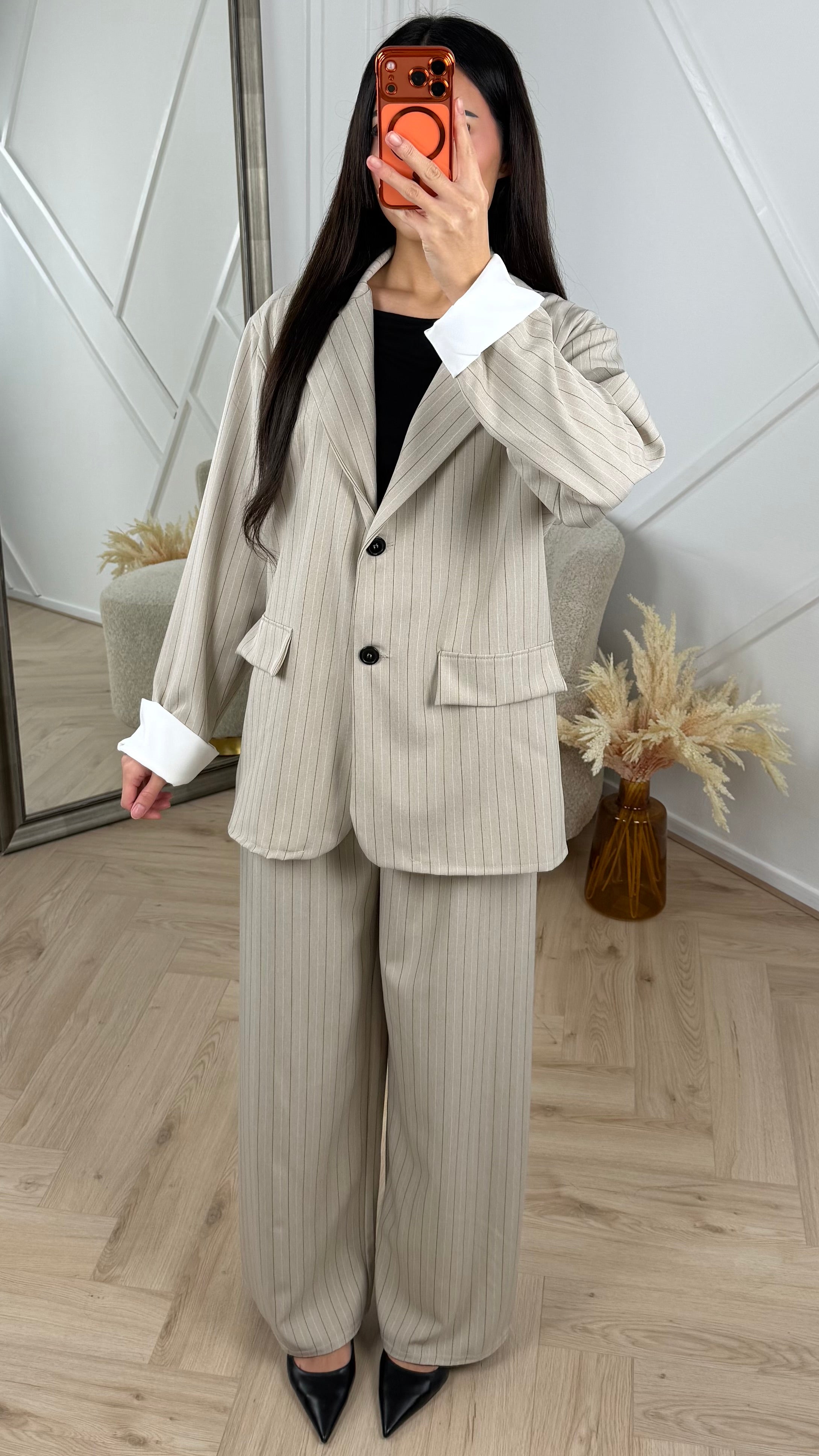 Deze pinstripe blazer set geeft direct een verzorgde en stijlvolle look. De combinatie van de rechte blazer en de wijde pantalon zorgt voor een krachtige, moderne uitstraling, terwijl de fijne krijtstreep het geheel extra chic maakt. De witte omgeslagen manchetten geven de set een opvallend contrast en maken hem net wat specialer.
