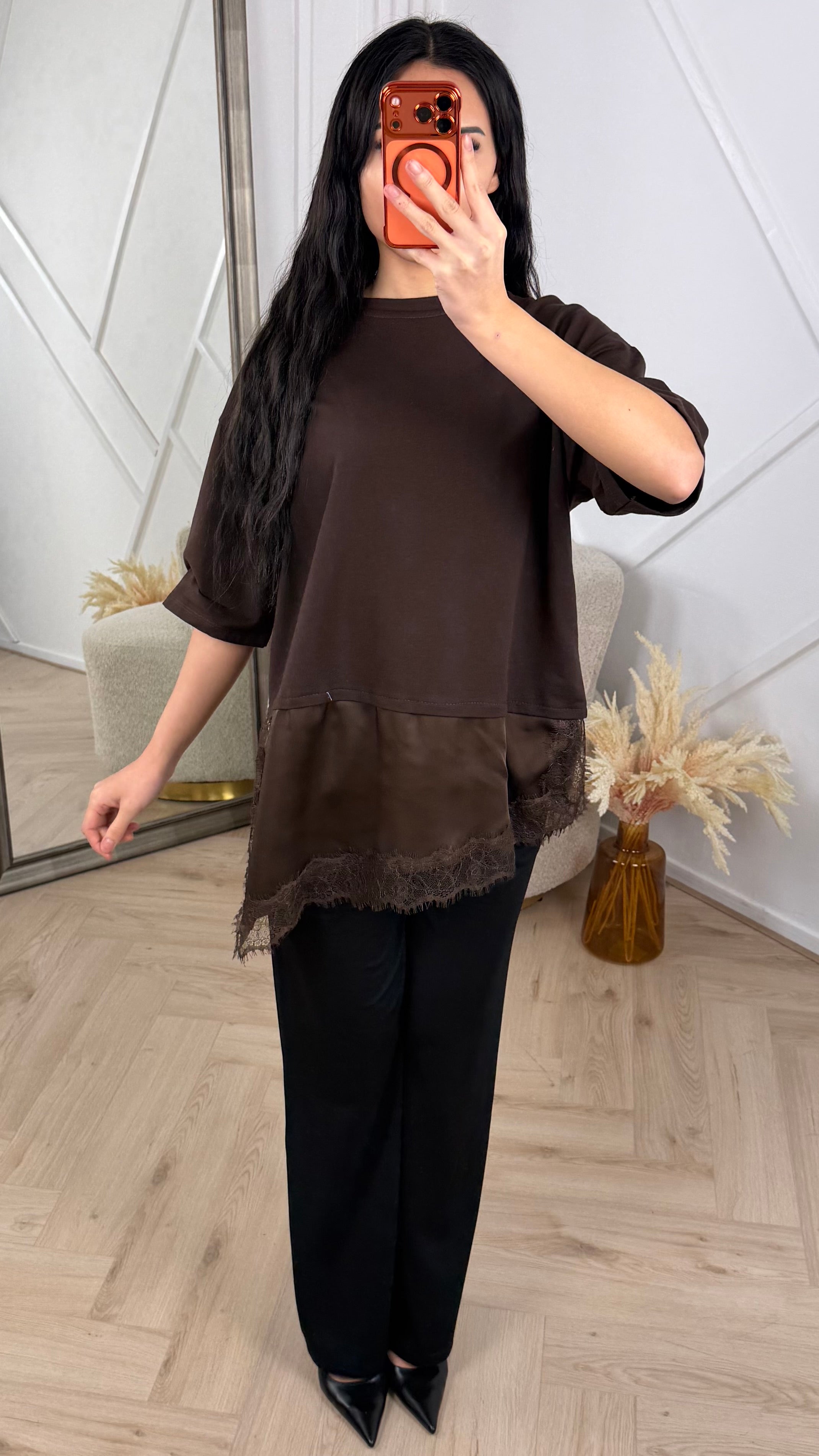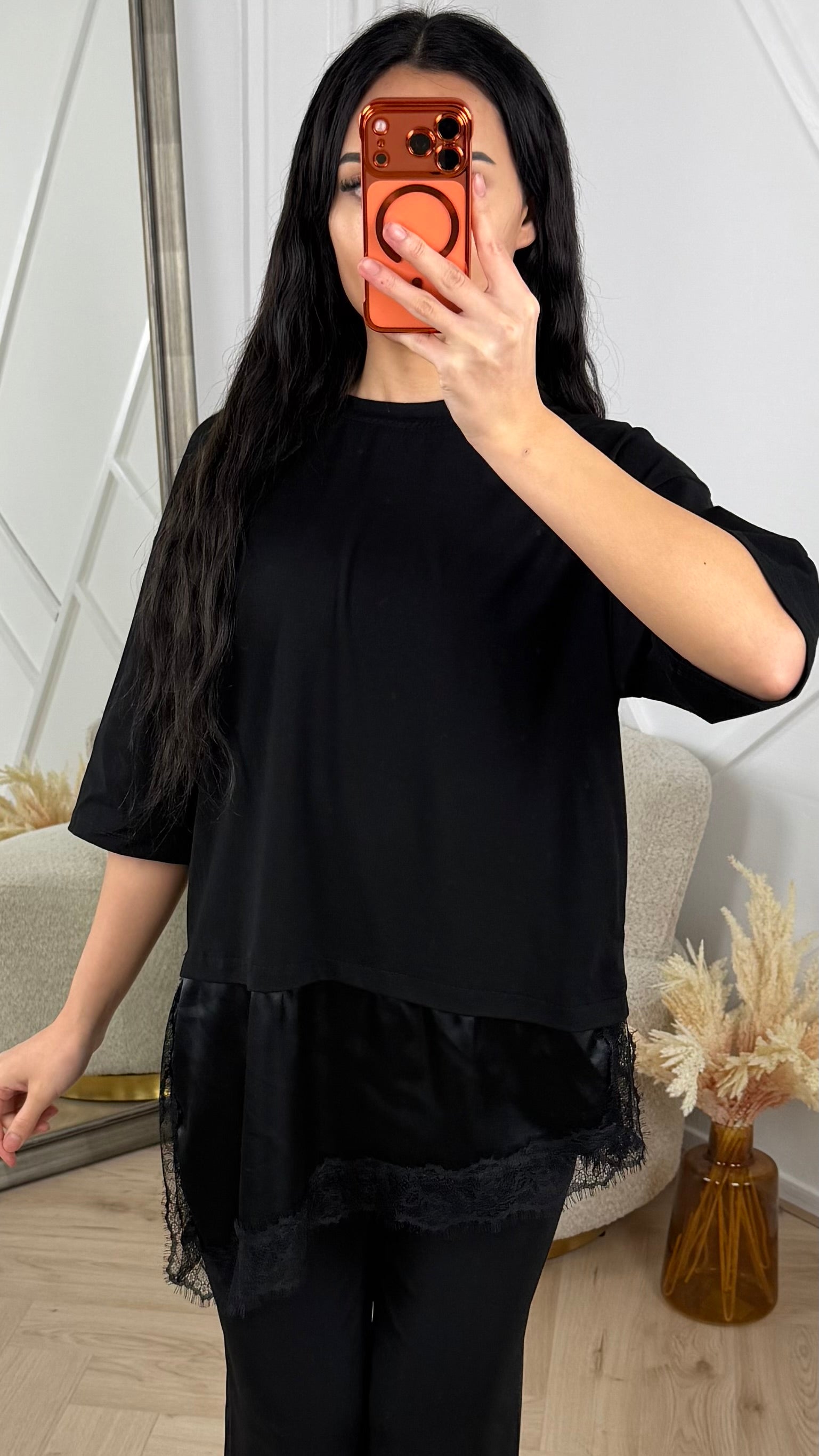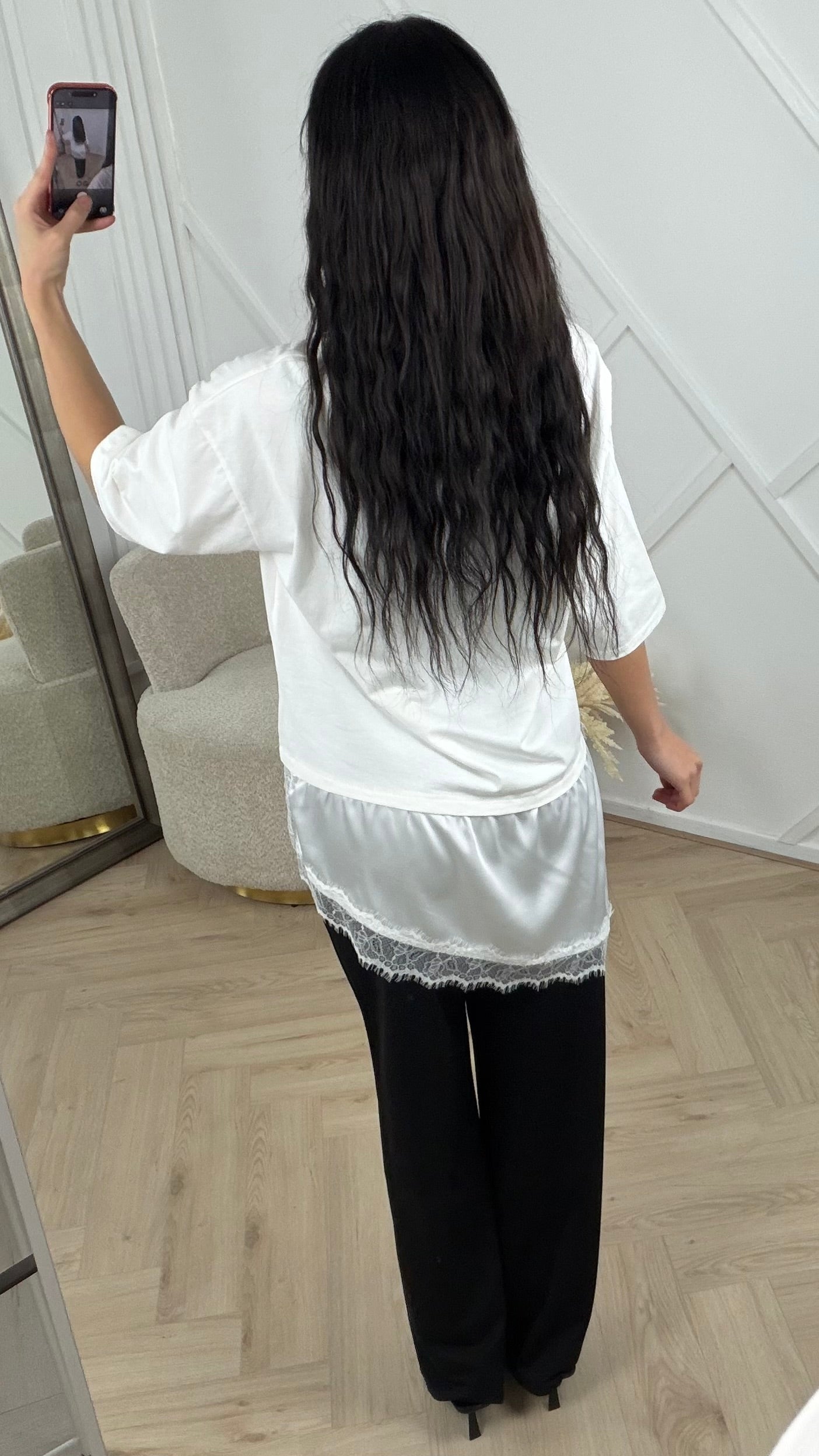 T-Shirt Top met Satijnen Onderlaag en Kant